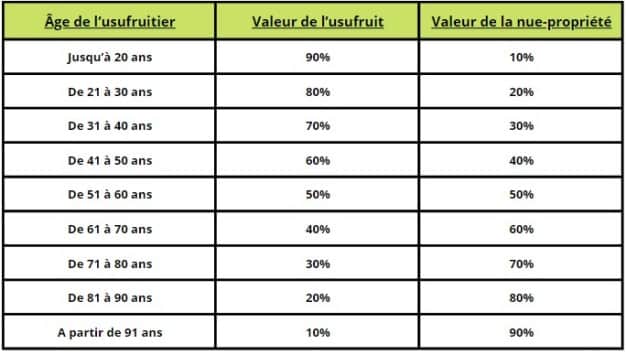 Pour les biens en usufruit et en nue-propriété, leur valeur est déterminée en fonction de l’âge de l’usufruitier selon le barème suivant :