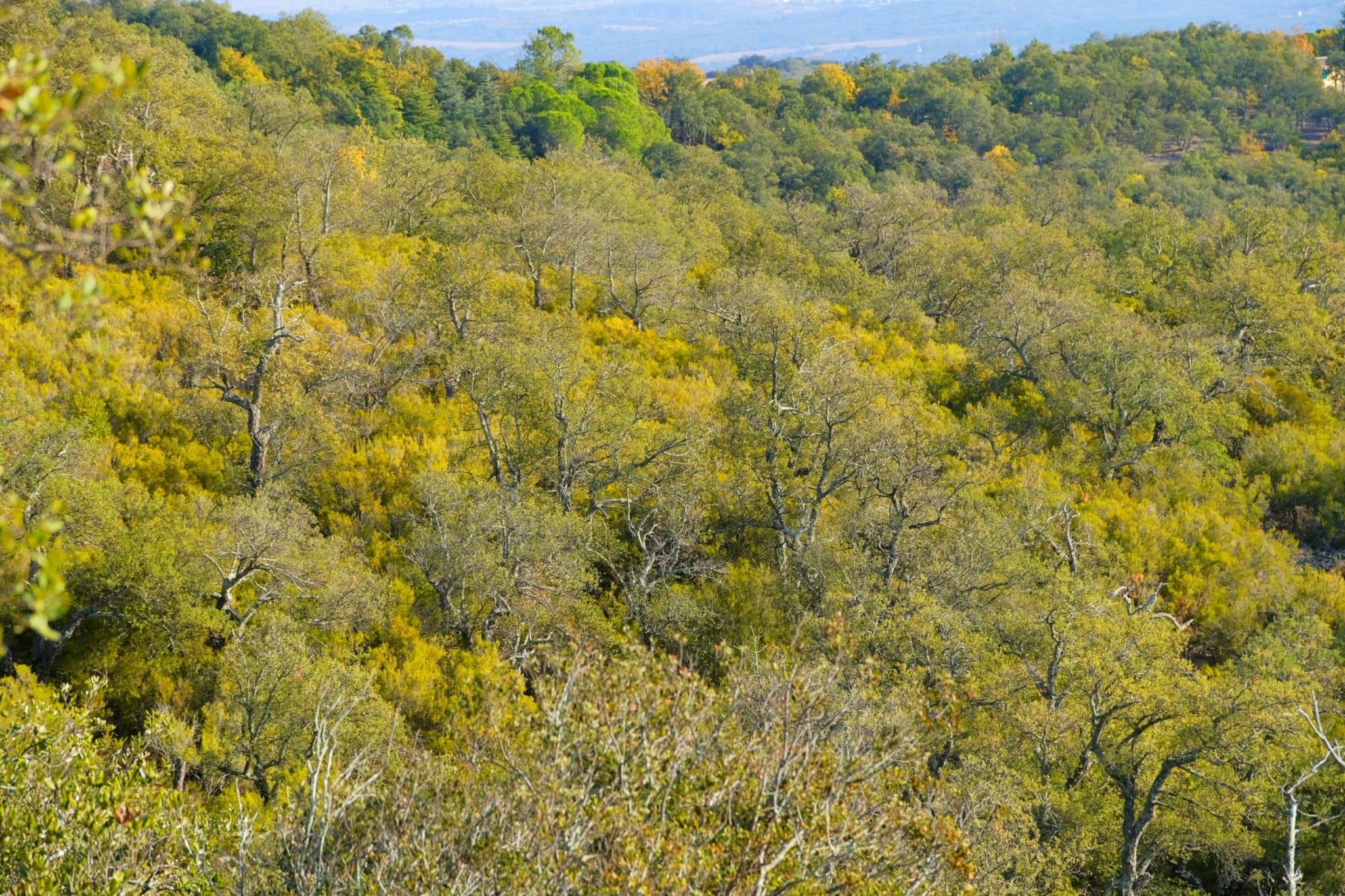 Au nord, trois parcelles adjacentes couvrent environ 11 ha, facilement accessibles grâce à un chemin carrossable traversant du nord au sud, et bordées sur 400 mètres par une route départementale. L’orientation nord-est assure une bonne exposition pour le développement forestier. Ce bloc est essentiellement peuplé de Chênes lièges (15 à 35 cm de diamètre, 4 à 10 m de hauteur), accompagnés de chênes verts bien répartis, avec une concentration au nord où subsistent d’anciens chemins d’exploitation. Environ 1 hectare est occupé par des châtaigniers, renforçant la diversité des essences. Le relief présente une pente douce à modérée (10 à 20 %), avec une partie plane sur un plateau et un fond de vallée traversé par un ruisseau temporaire.