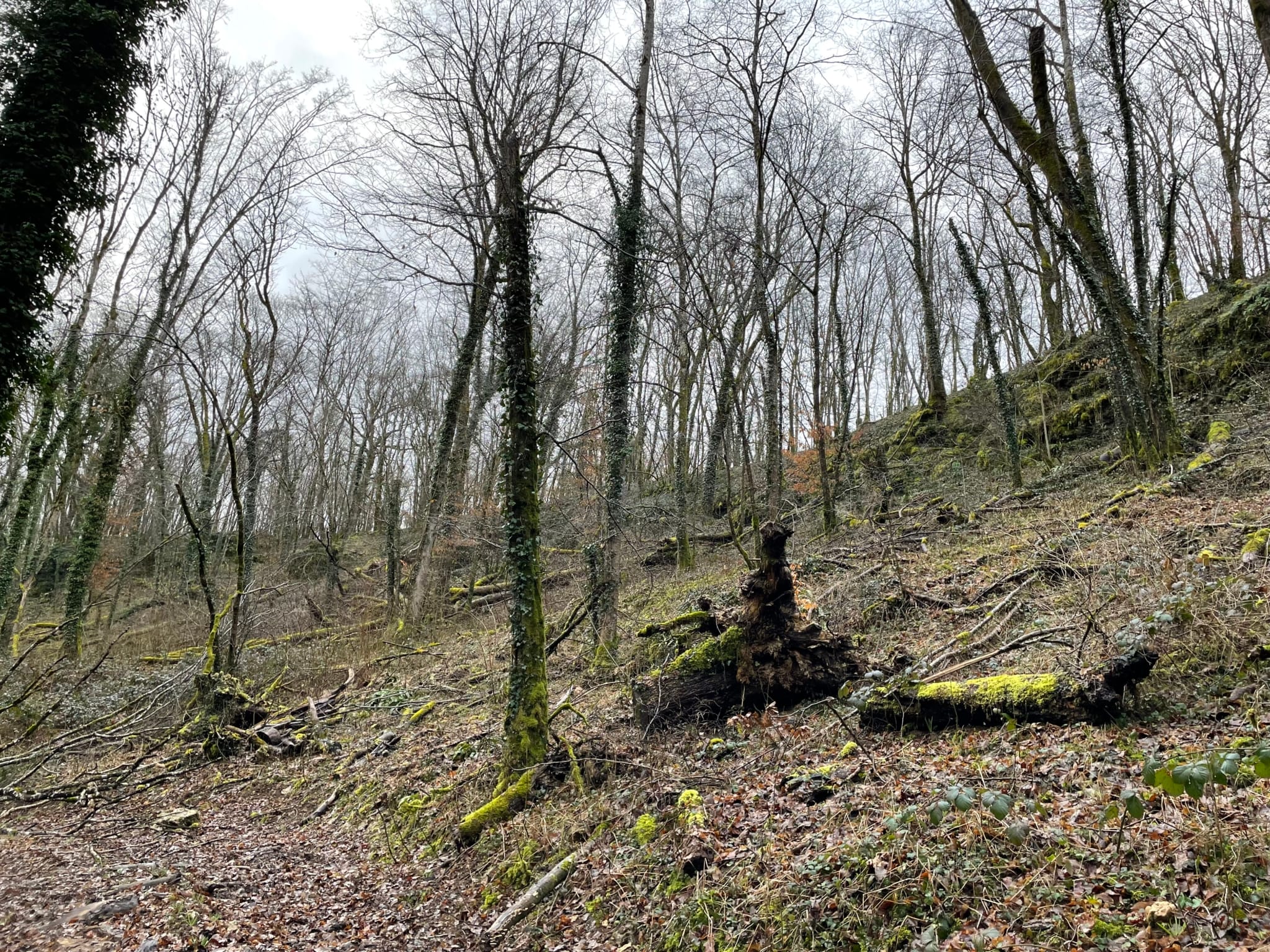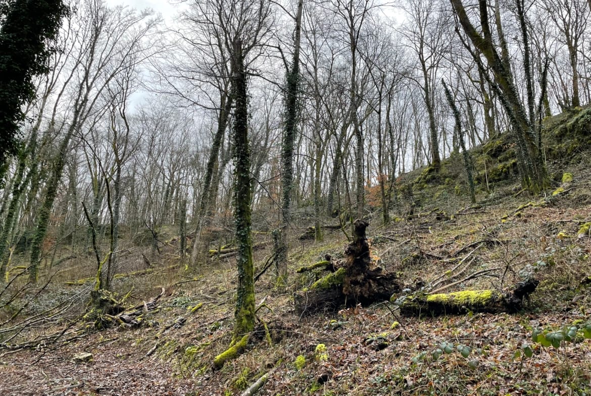 L’état sanitaire est marqué par l’extraction récente des frênes dépérissant, bien que des spécimens exploitables de plus de 60 cm subsistent. La qualité globale des bois est orientée vers des usages techniques tels que le sciage, la charpente ou la fabrication de traverses. La propriété bénéficie d’une forte dynamique naturelle, avec une régénération de hêtres et d’érables déjà bien installée dans les trouées de lumière.