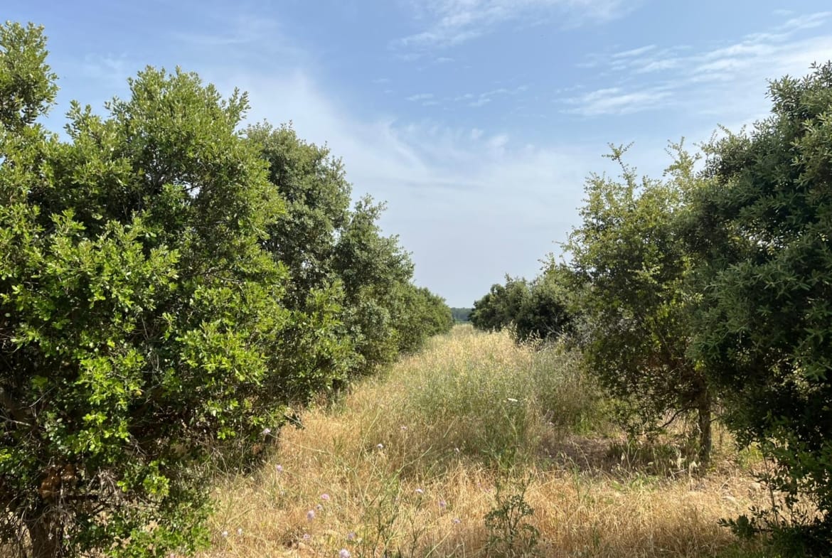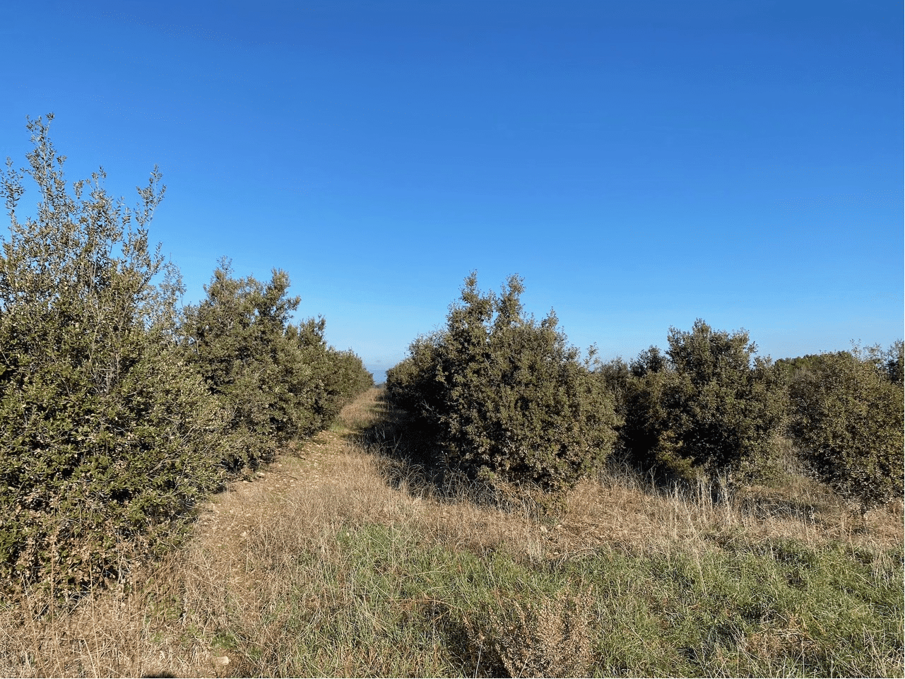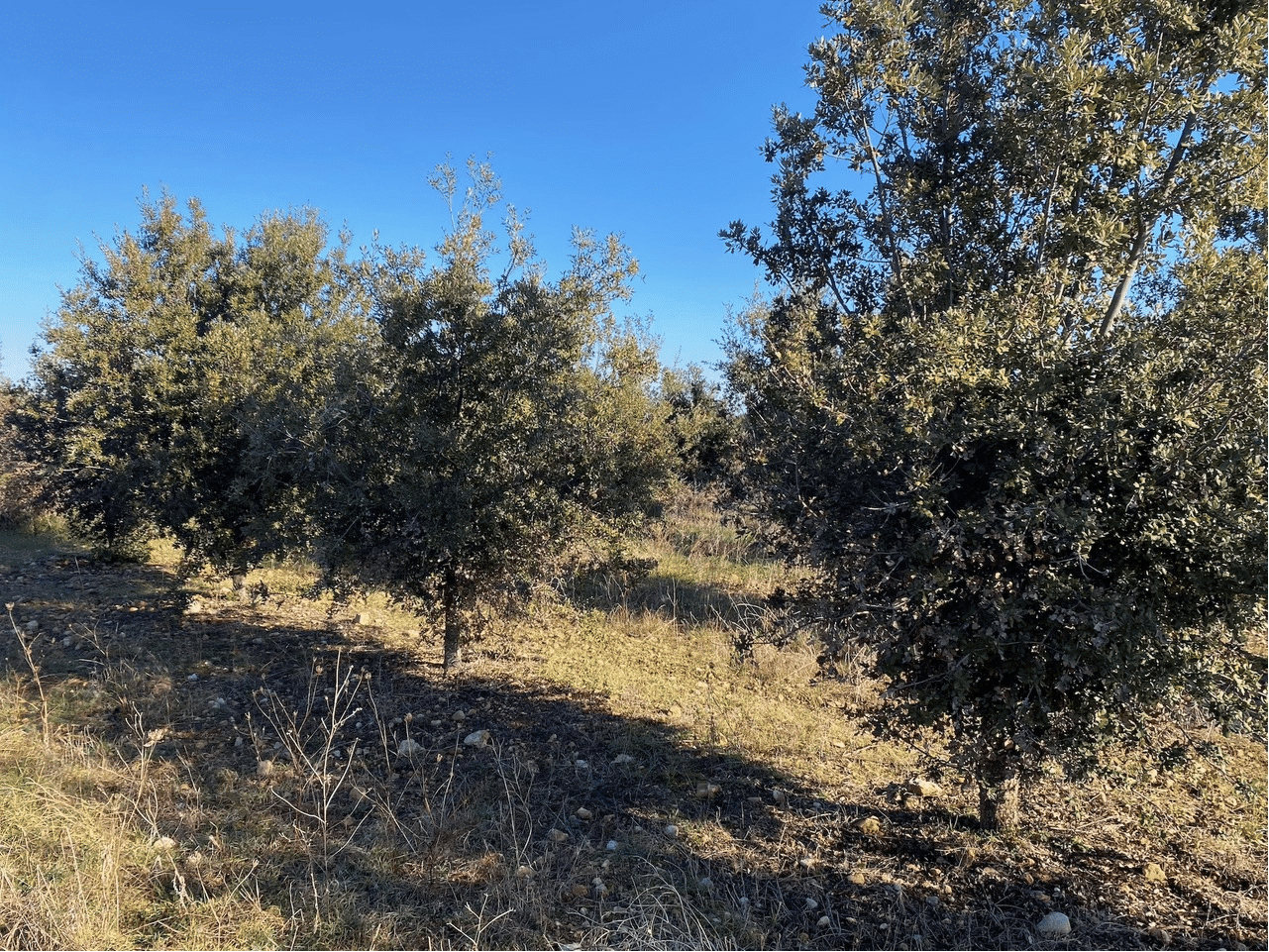 À Aumes, dans l’Hérault, cette truffière plantée en 2012 avec des plants mycorhizés INRA a commencé à produire en 2019. Depuis 2020, elle n’est plus entretenue, mais plus de 85 % des plants sont encore mycorhizés, offrant un excellent socle de reprise. Un simple nettoyage, la taille des arbres et un passage du broyeur suffiraient à redynamiser la parcelle.